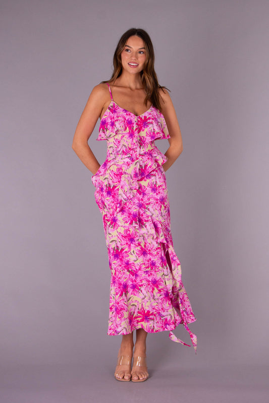 BLOOMED ELEGENCE FLORAL MIDI DRESS IN MAGENTA