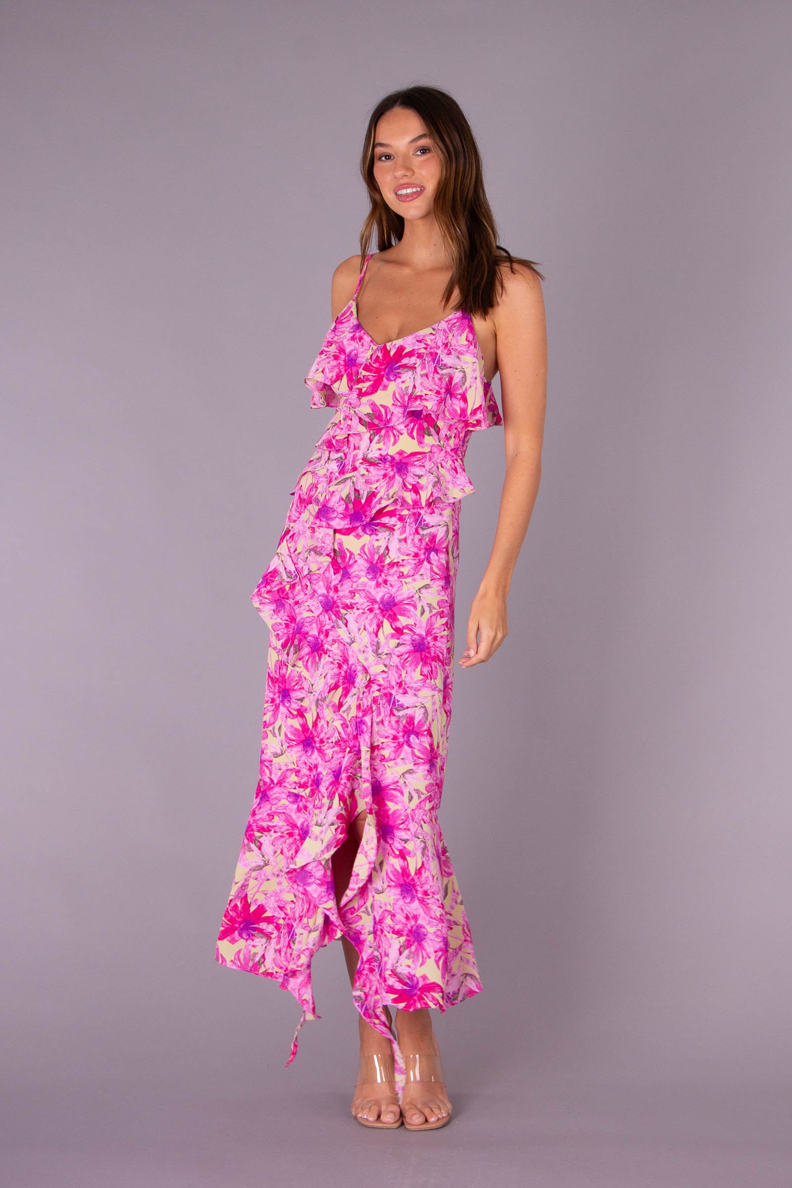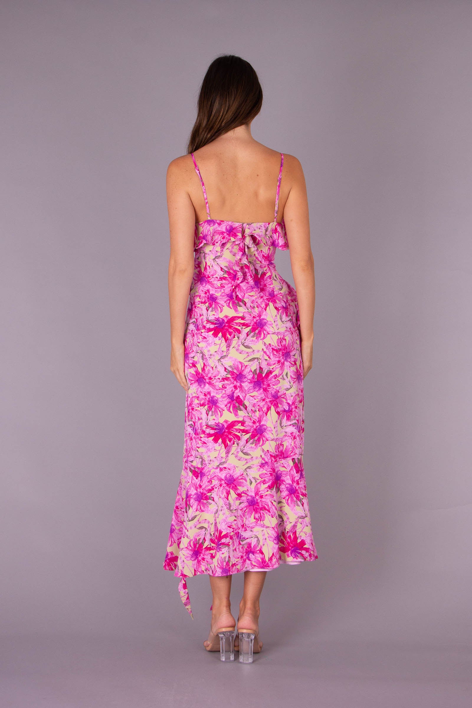 BLOOMED ELEGENCE FLORAL MIDI DRESS IN MAGENTA