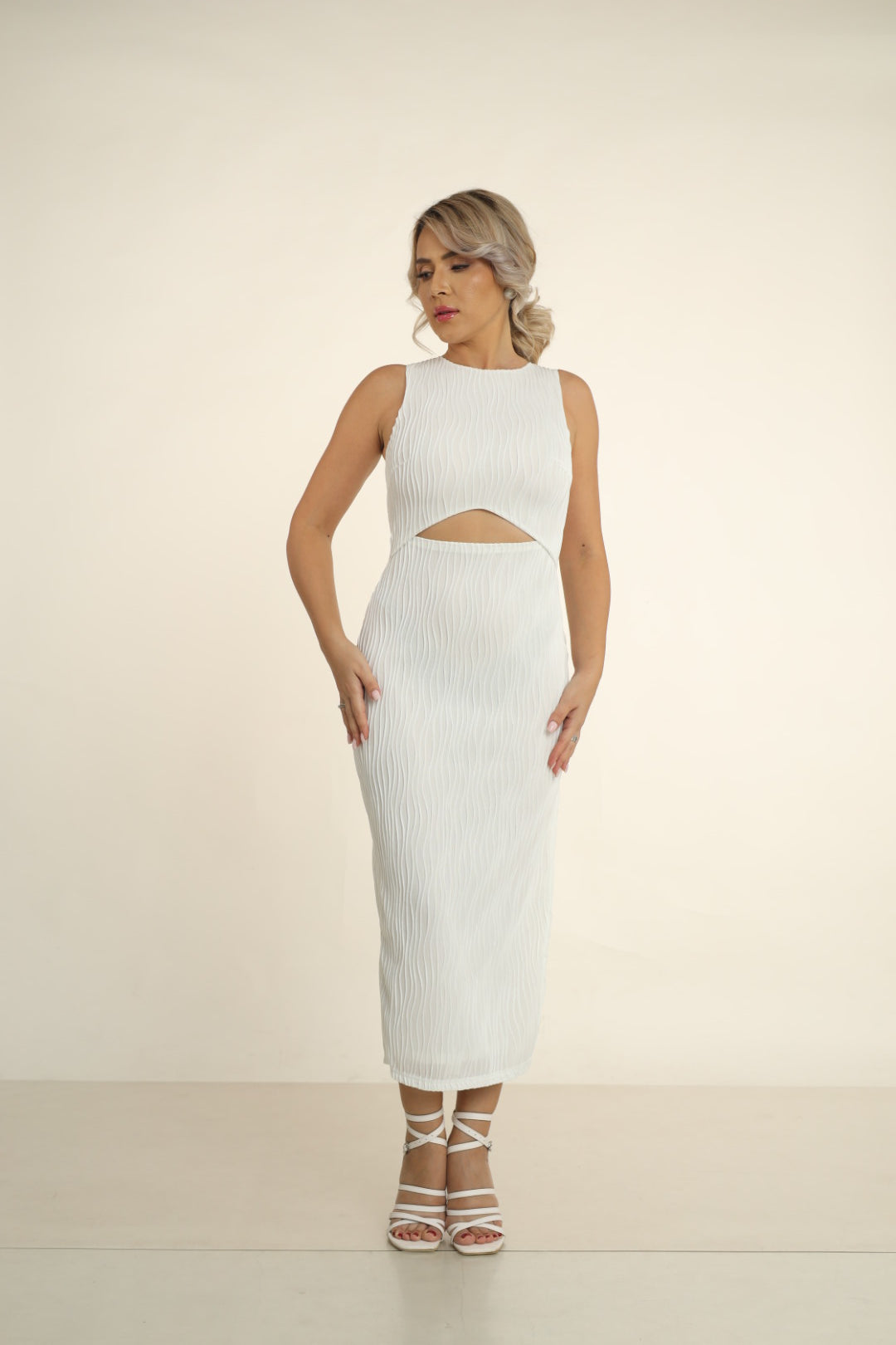 REGALIA TEXTURED STRETCH MIDI DRESS WITH FRONT CUT OUT DETAIL IN WHITE